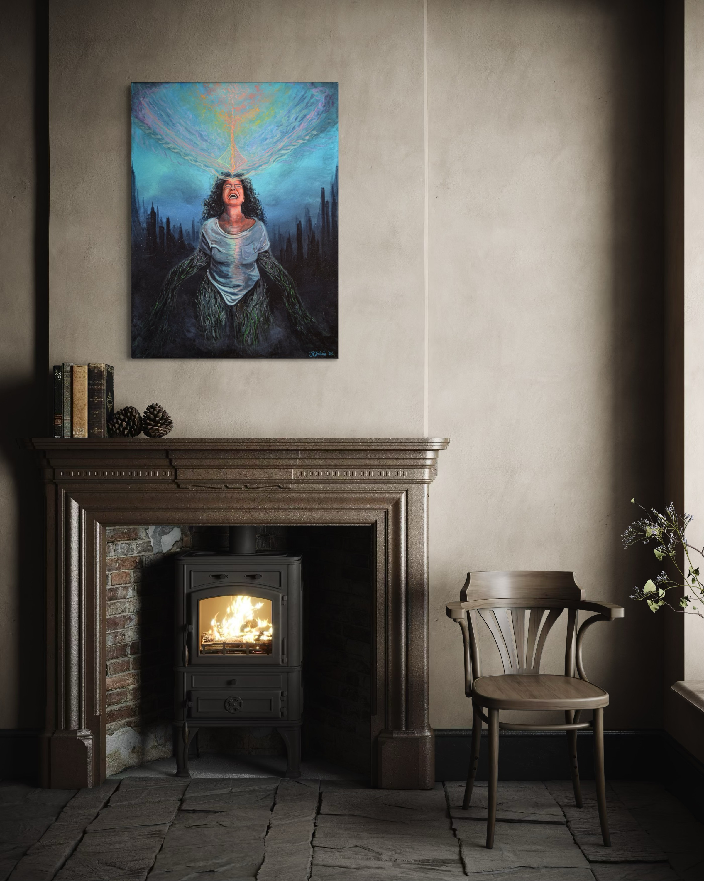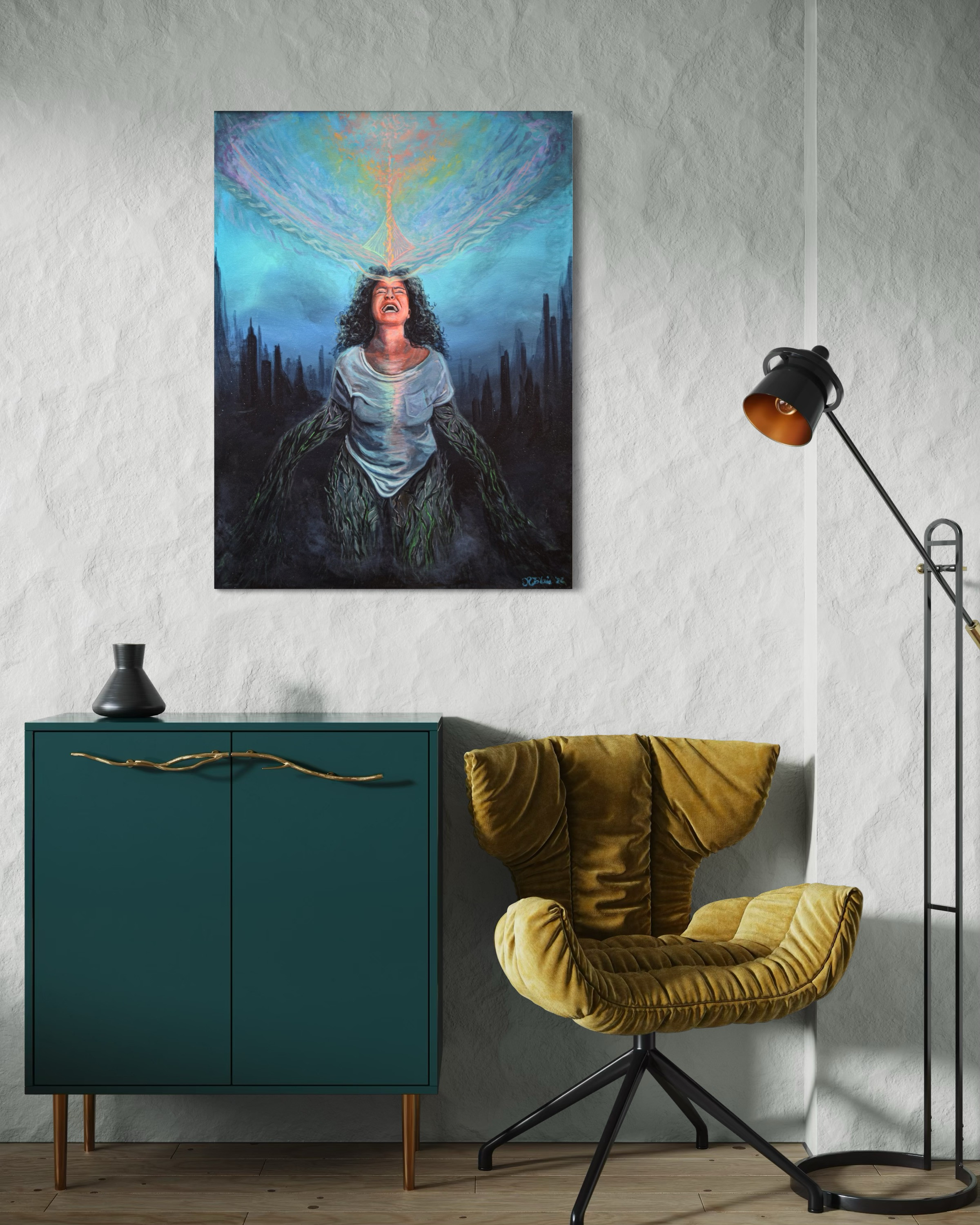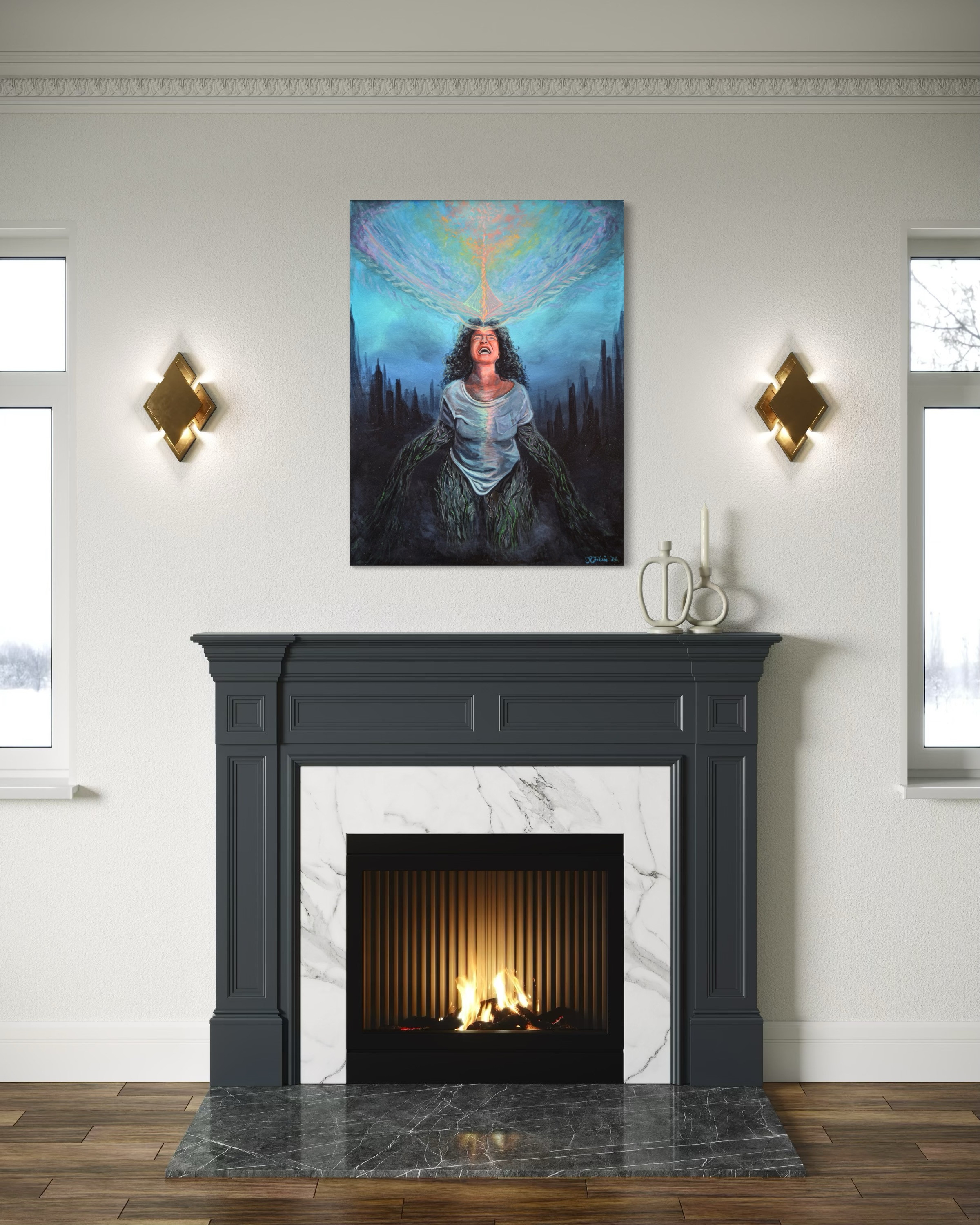 Inspired by the ancient Hermetic principle, this piece maps the correspondence between cosmic and earthly realms. Celestial patterns mirror terrestrial forms in a symmetry that reveals the fundamental unity of all creation. Deep blues and radiant golds create a visual bridge between heaven and earth.