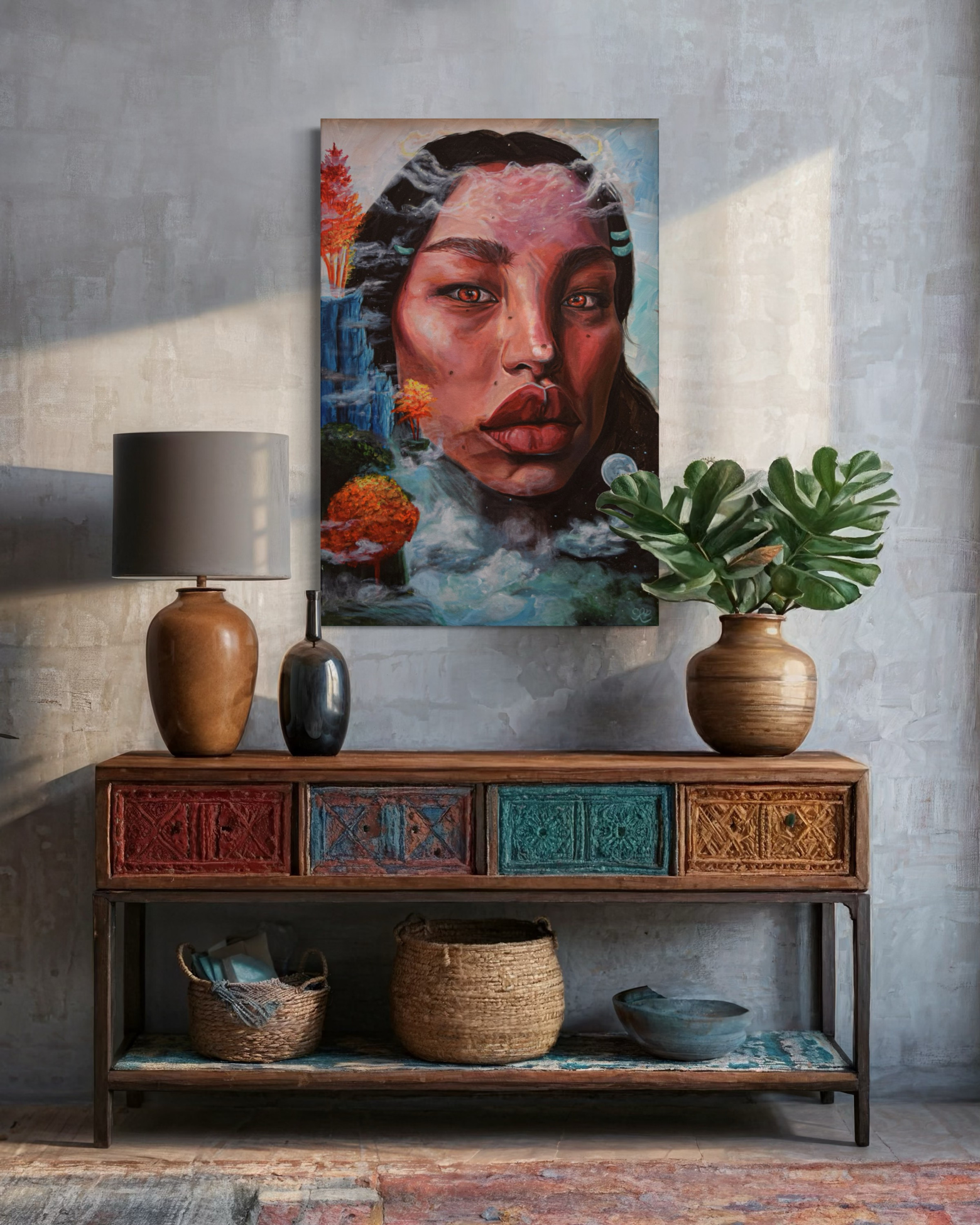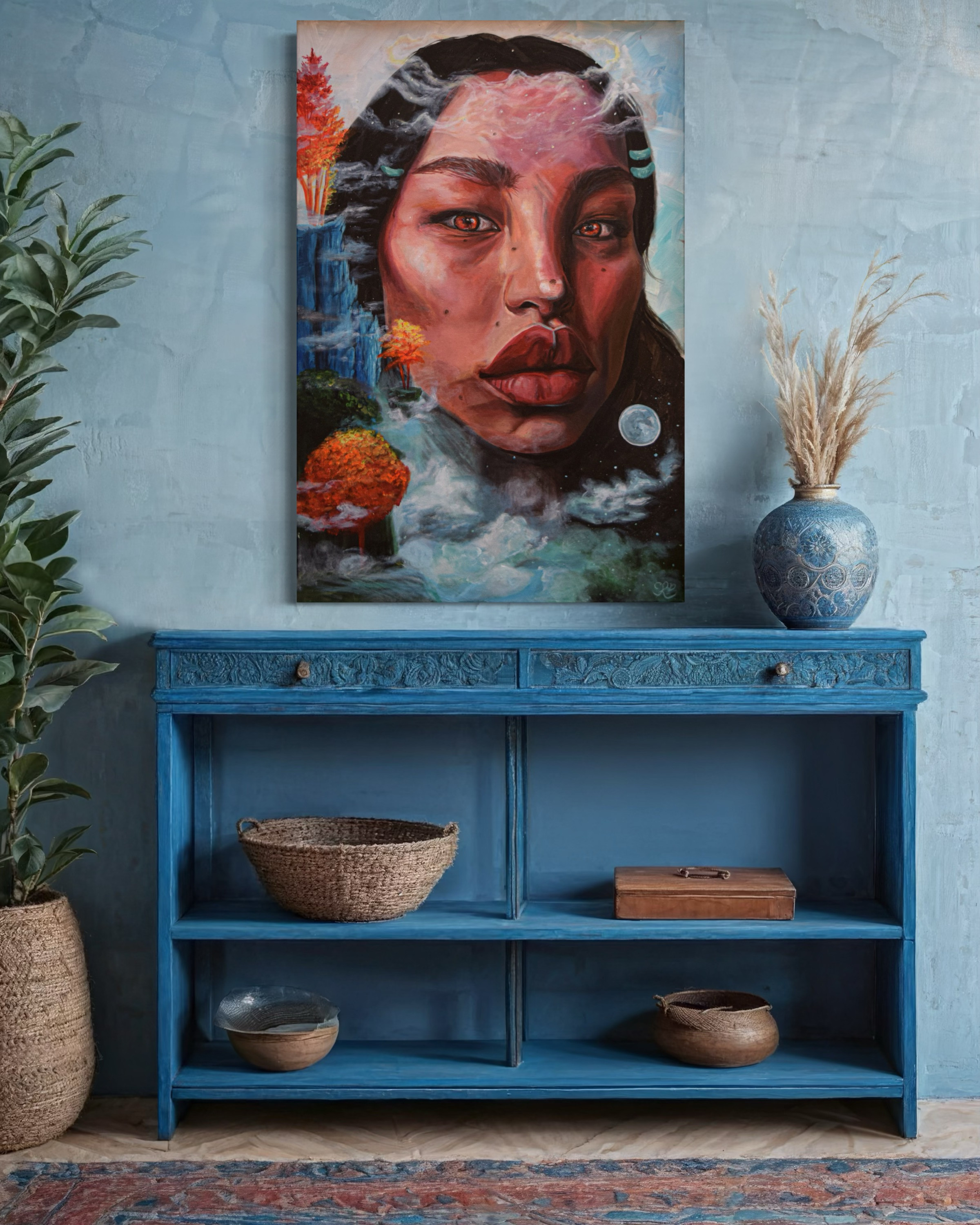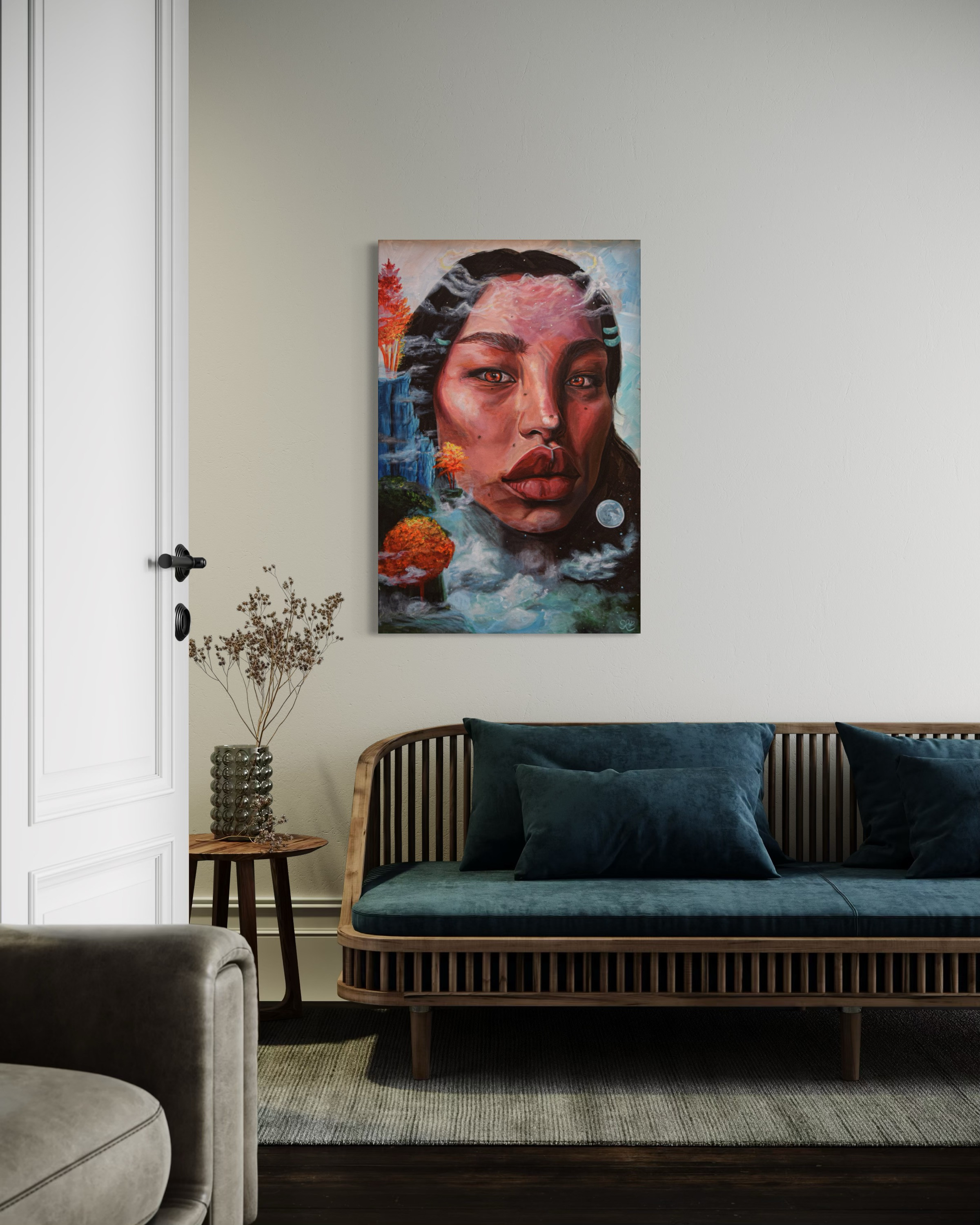 The boundary between self and universe dissolves in this transcendent work. A figure merges with swirling cosmic energy, becoming one with the infinite. Gold leaf and metallic pigments catch the light, creating a surface that seems to breathe and shift — alive with the energy of connection.