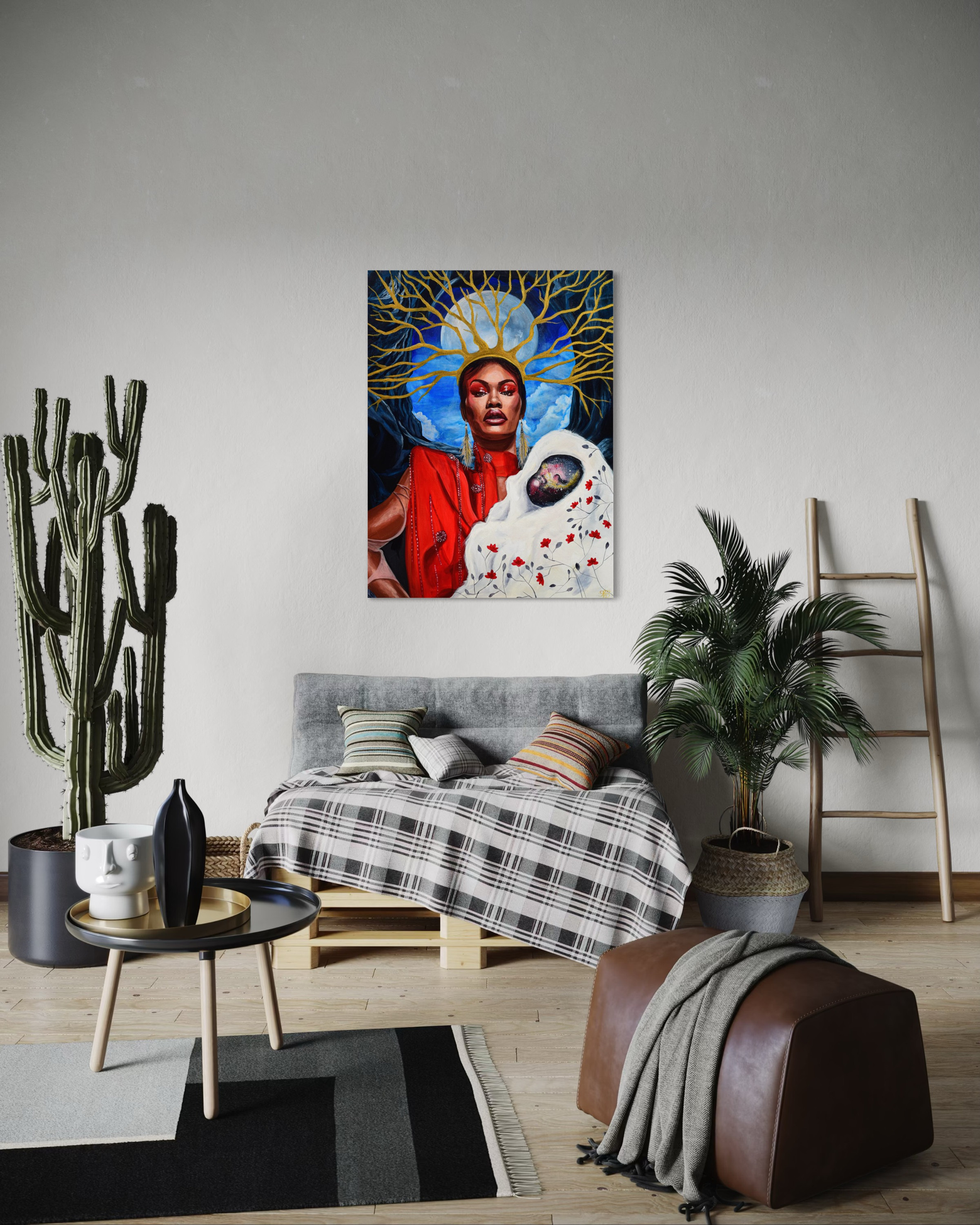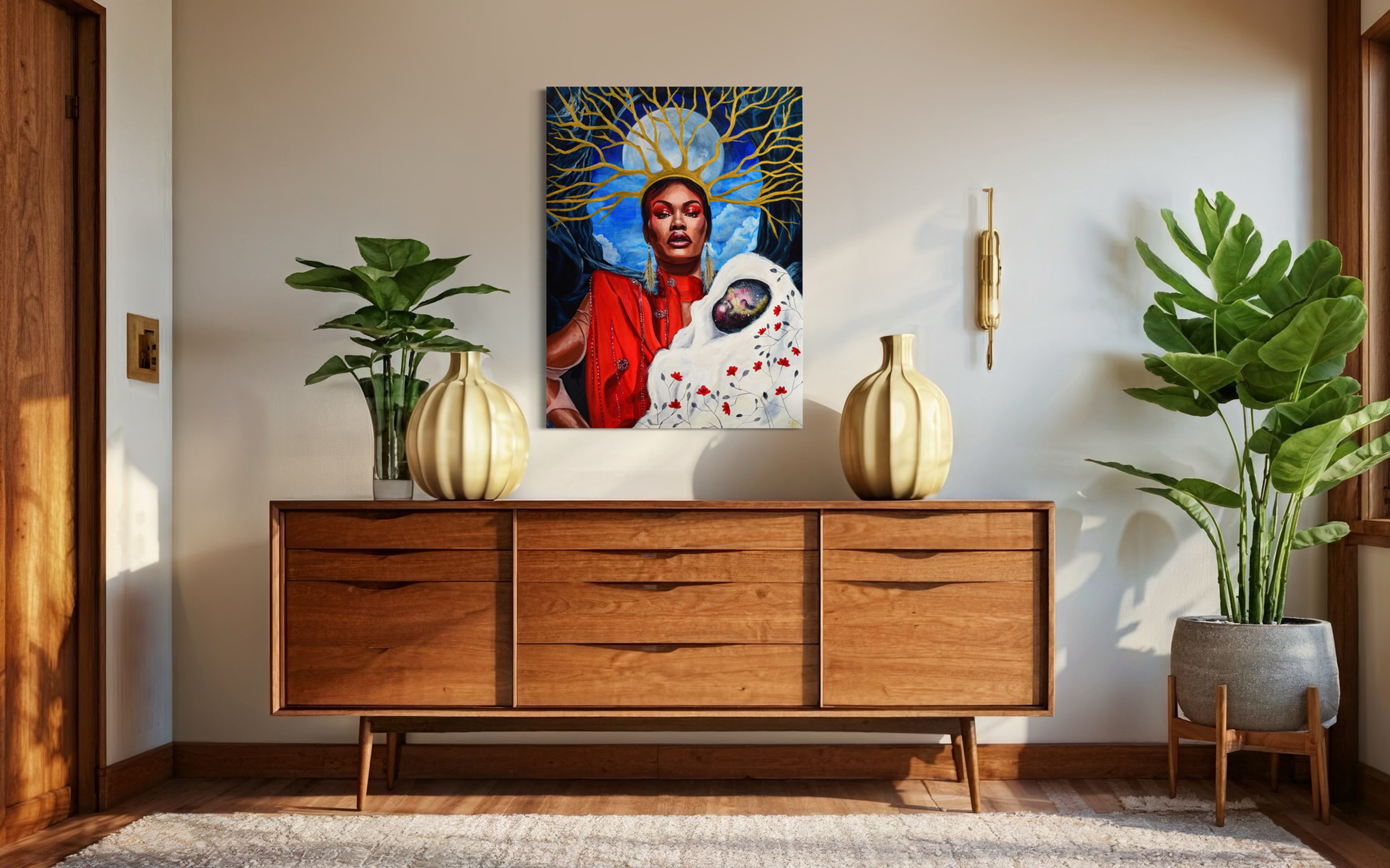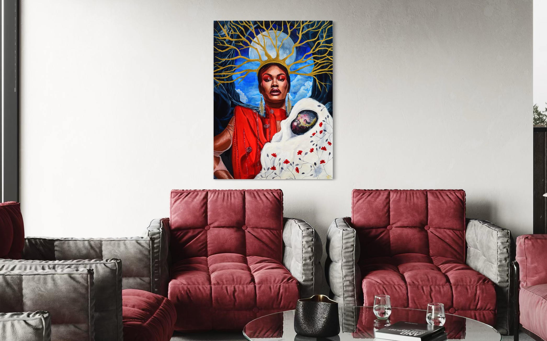 A transcendent exploration of time and consciousness. Layers of luminous color flow between realms of past memory, present awareness, and future possibility. This large-scale piece invites the viewer into a meditation on the eternal now — where ancestral wisdom meets the unfolding moment.