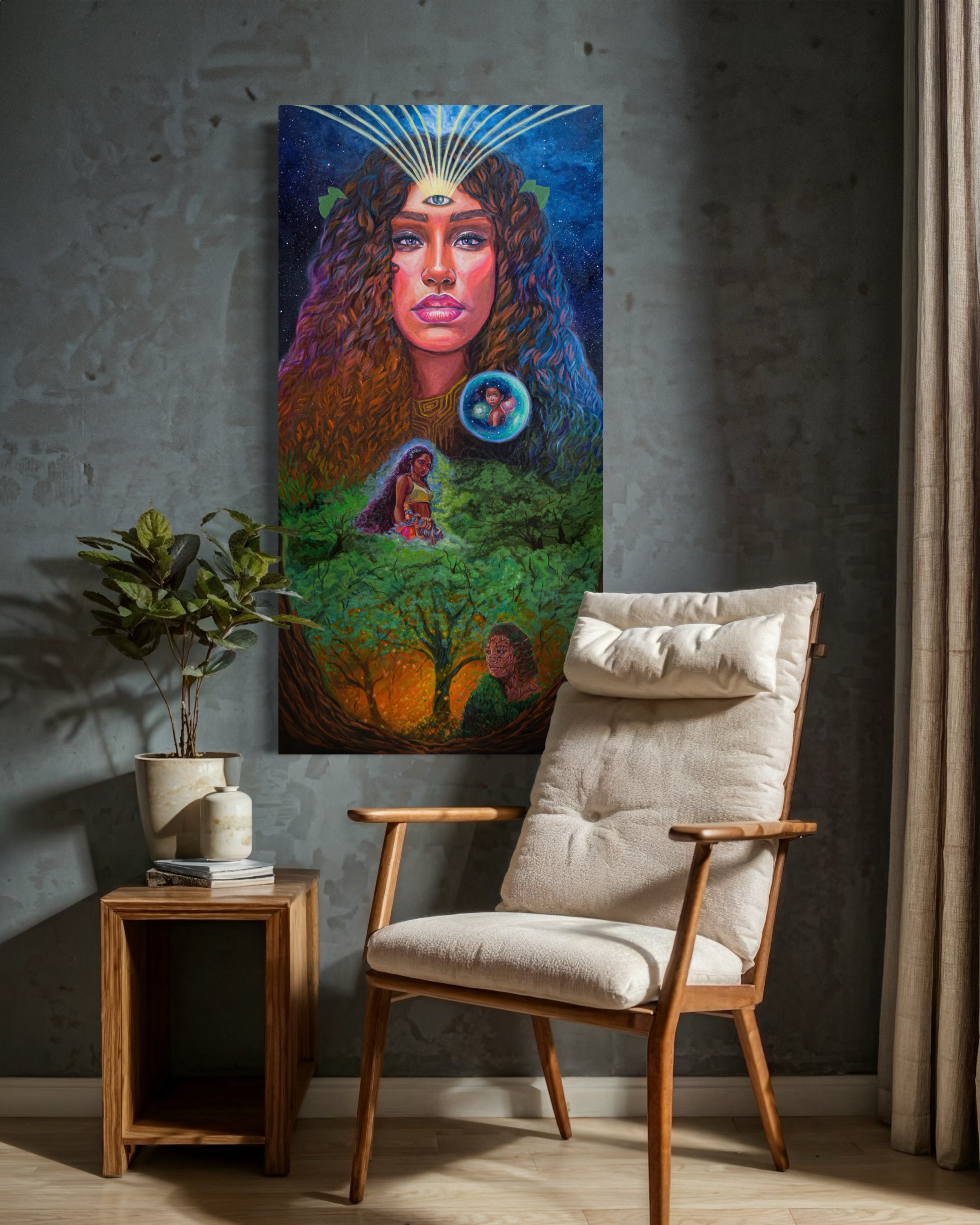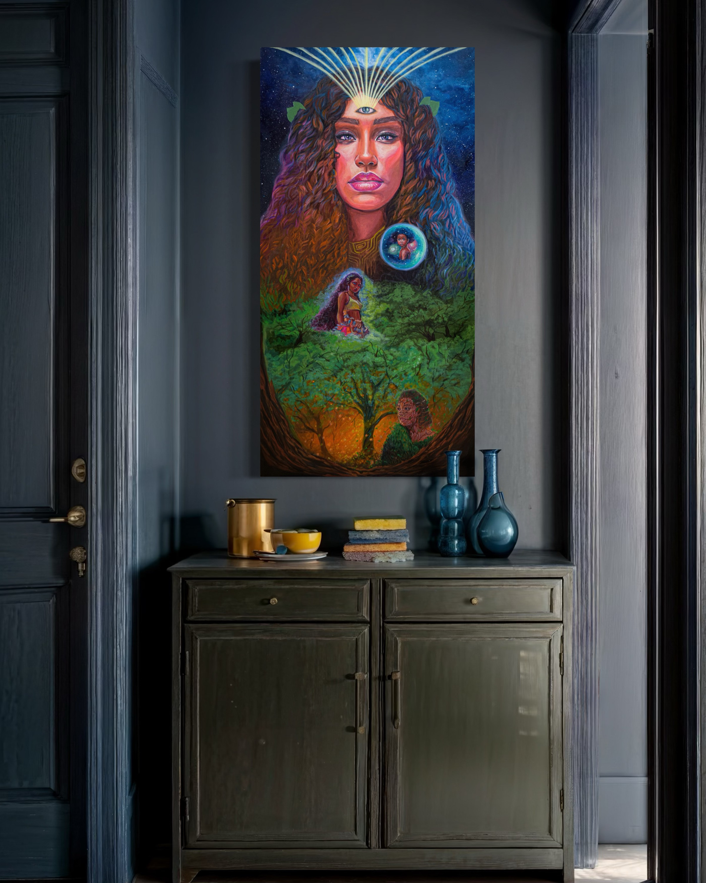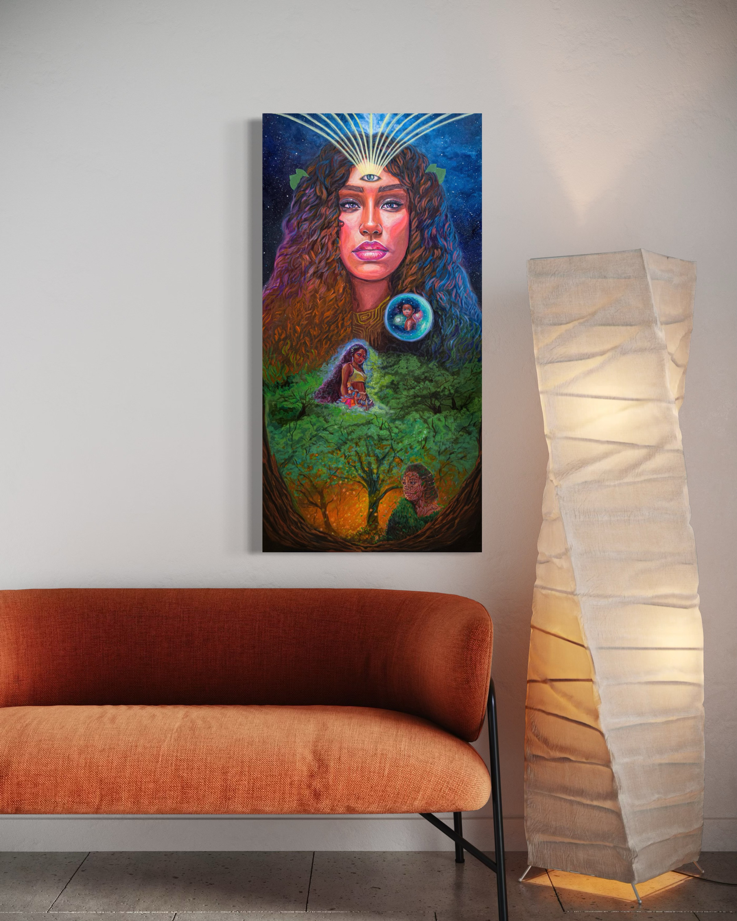 A powerful vision of rebirth and transformation. Ethereal forms emerge from deep cosmic darkness, ascending through layers of golden light and spiritual energy. The painting captures the moment between worlds — death and rebirth, ending and beginning — rendered in a palette that pulses with divine fire.