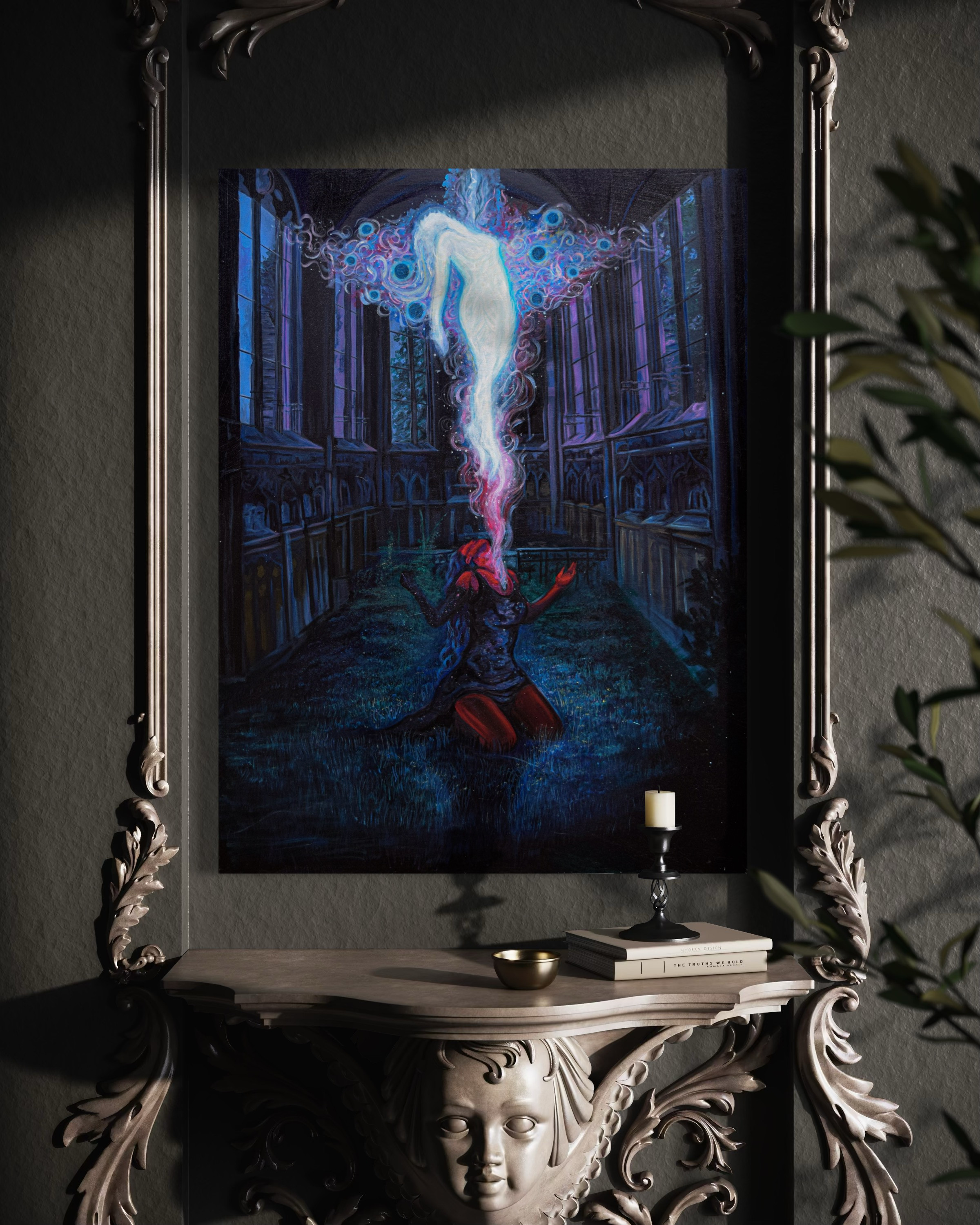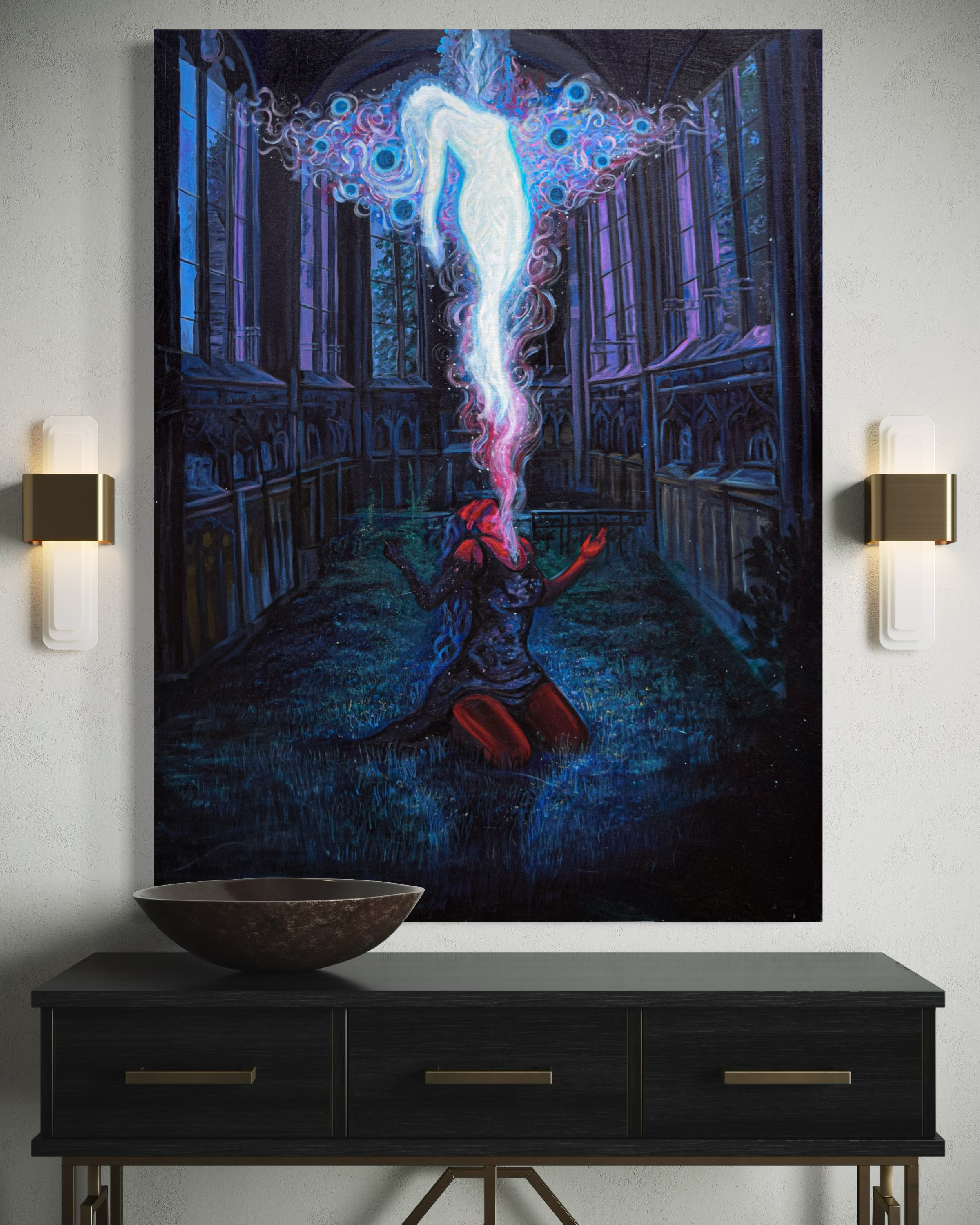 Like a phoenix rising from the depths, this painting captures the unstoppable force of renewal. Deep indigos give way to blazing golds and warm ambers as abstract forms surge upward with irresistible momentum. A meditation on resilience and the human spirit's refusal to stay down.