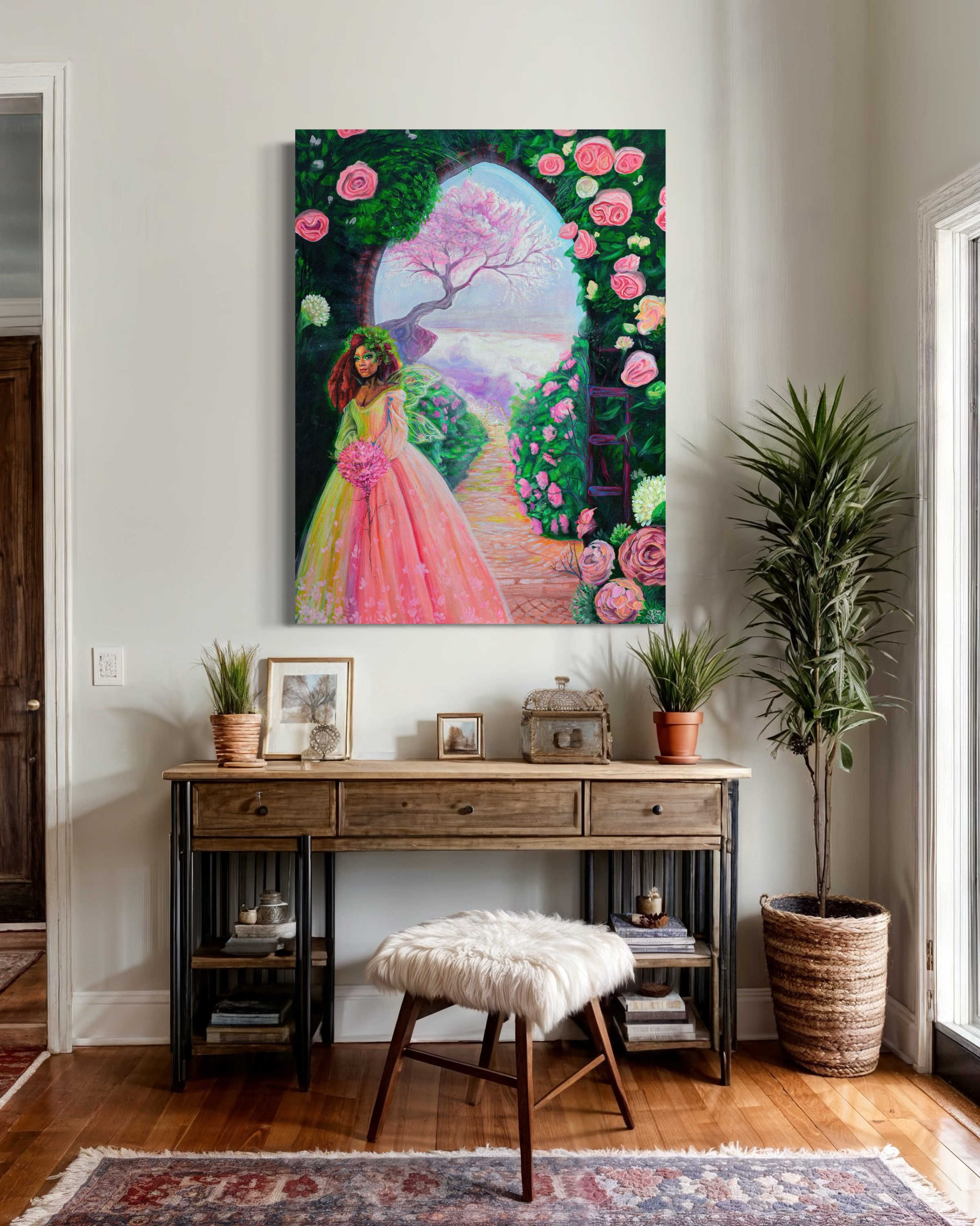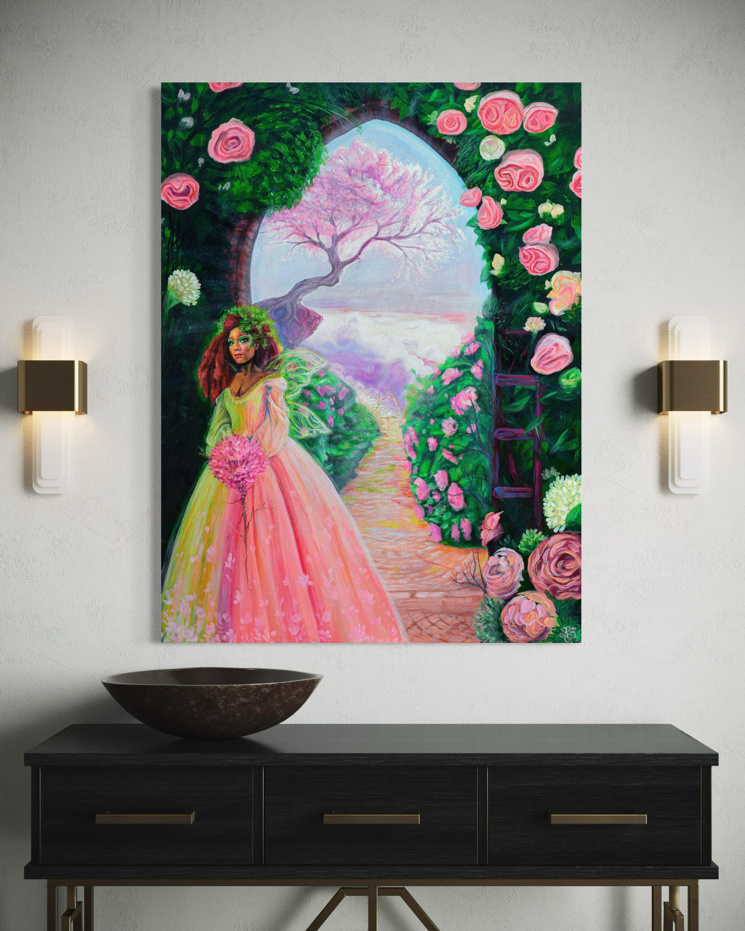 Created on the auspicious date of 2/22/22, this painting opens a gateway between dimensions. Swirling vortices of cosmic purple and electric gold draw the viewer through layers of consciousness into a realm where time collapses and all becomes one. A portal painting in the truest sense.